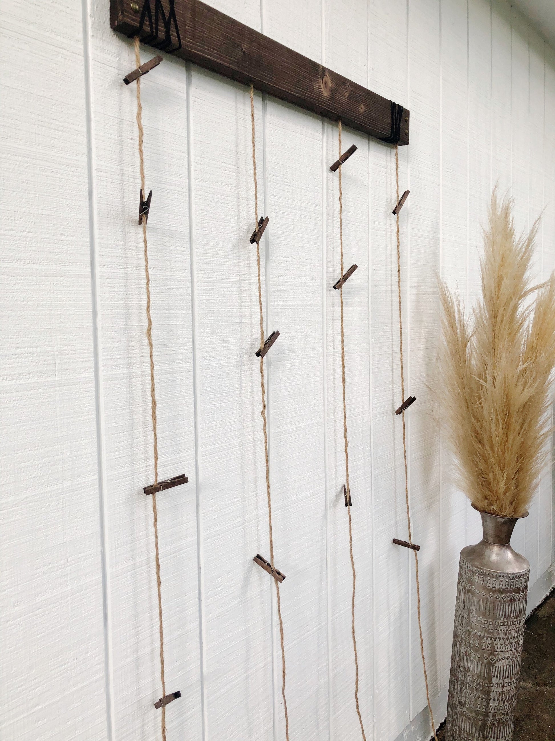 Industrial wood and Jute, hat display. Perfect for organizing rimmed hats. Embellished with wrapped black leather cord and upholstery tacks for an industrial look. Choose from 3 finishes and 2 sizes. Clips will come stained in your chosen finish. Jute is cut at 9ft long so that you may cut down to your desired length.