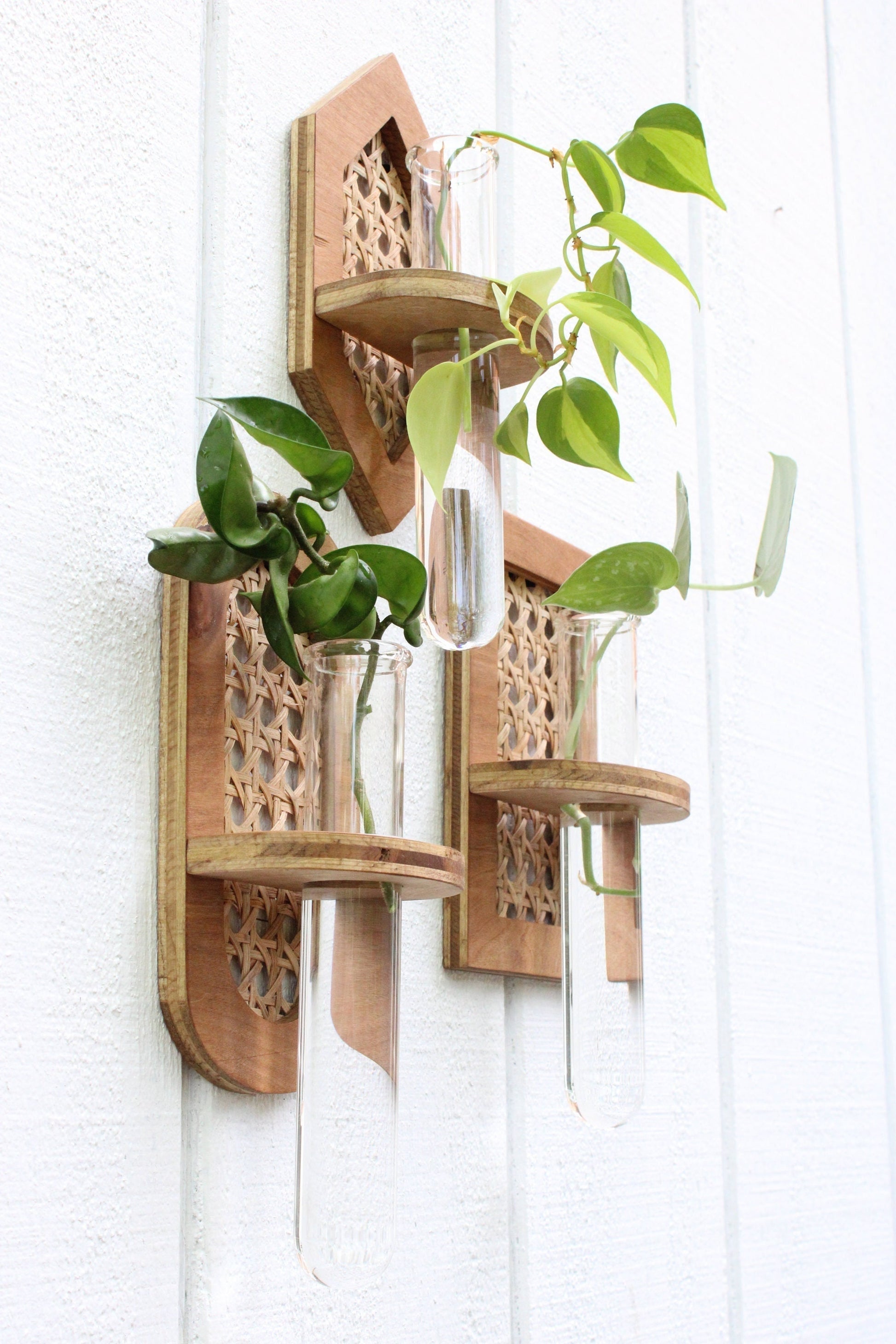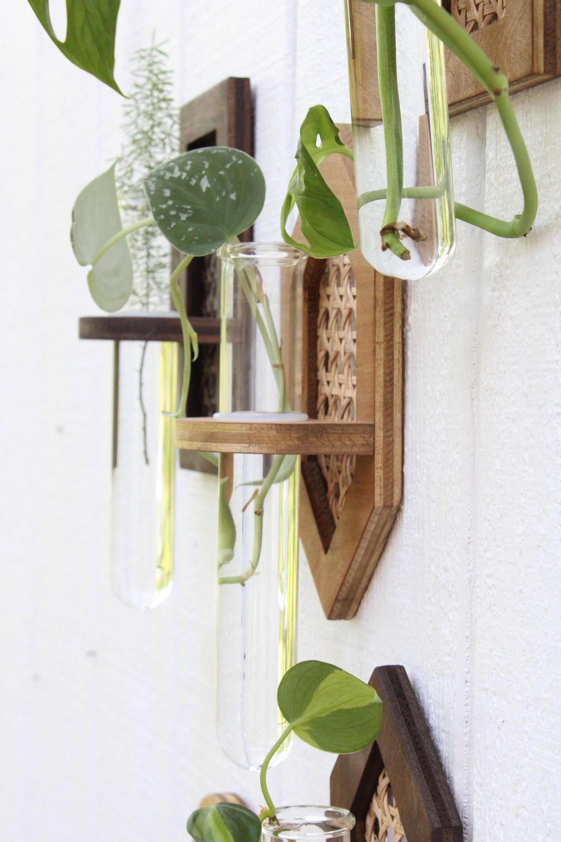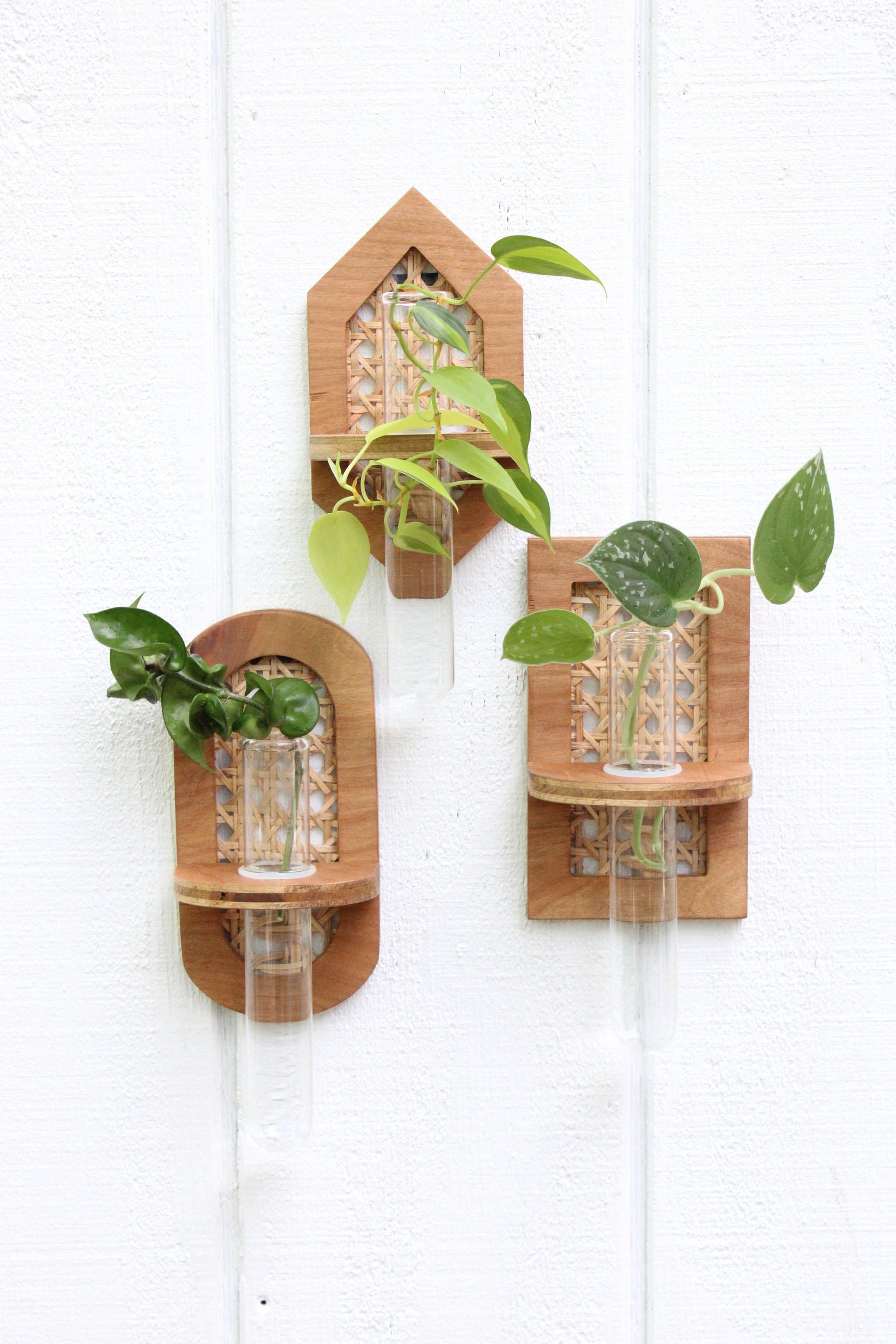 Rattan propagation wall hangings. Choose your shape and finishes. We offer oval, rectangle, and hexagon. Purchase individually or in a set. Each hanging comes with a jumbo test tube and silicone O ring for adjustable tube height. The tube measures 1.5X8" and bases measure roughly 7.5X4" depending what shape you purchase. Pieces attach to the wall with a sawtooth hanger installed on the back side of the base. See our storefront for additional propagation options.