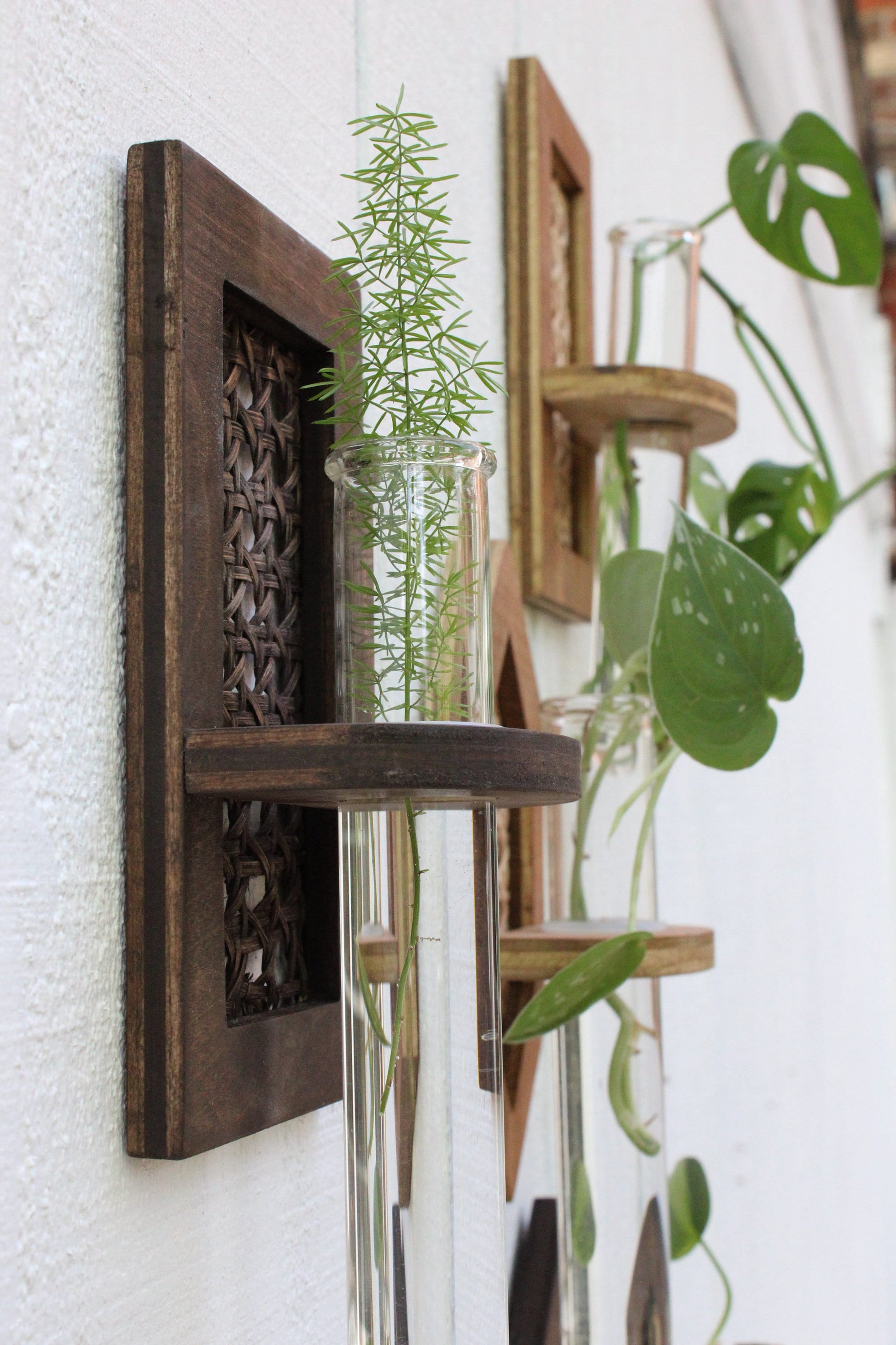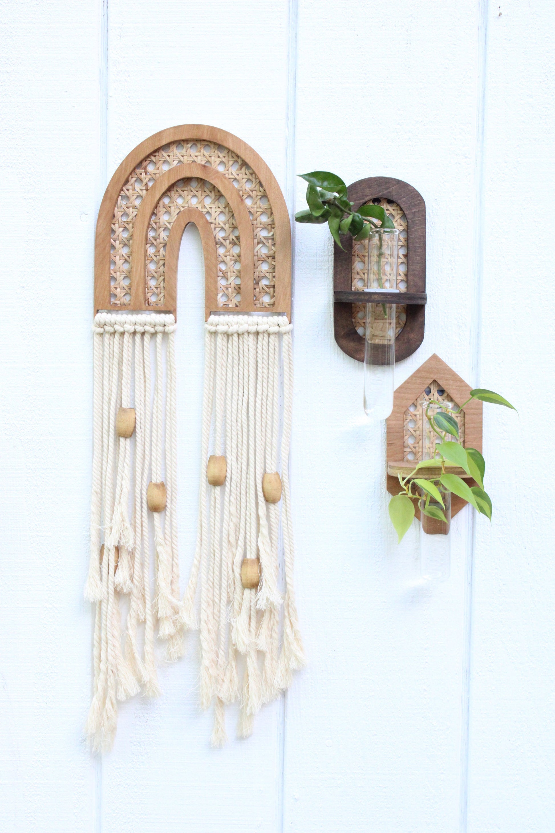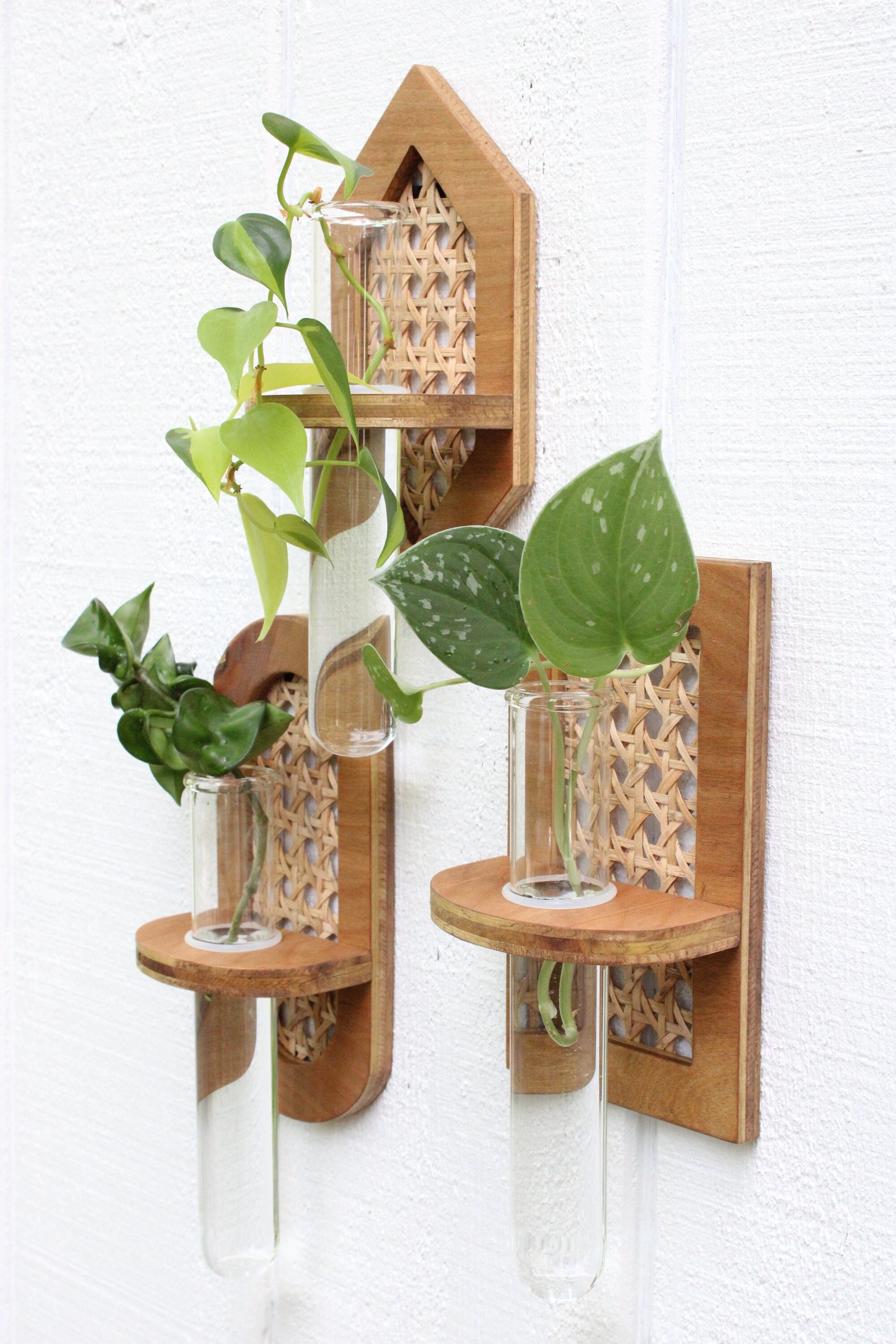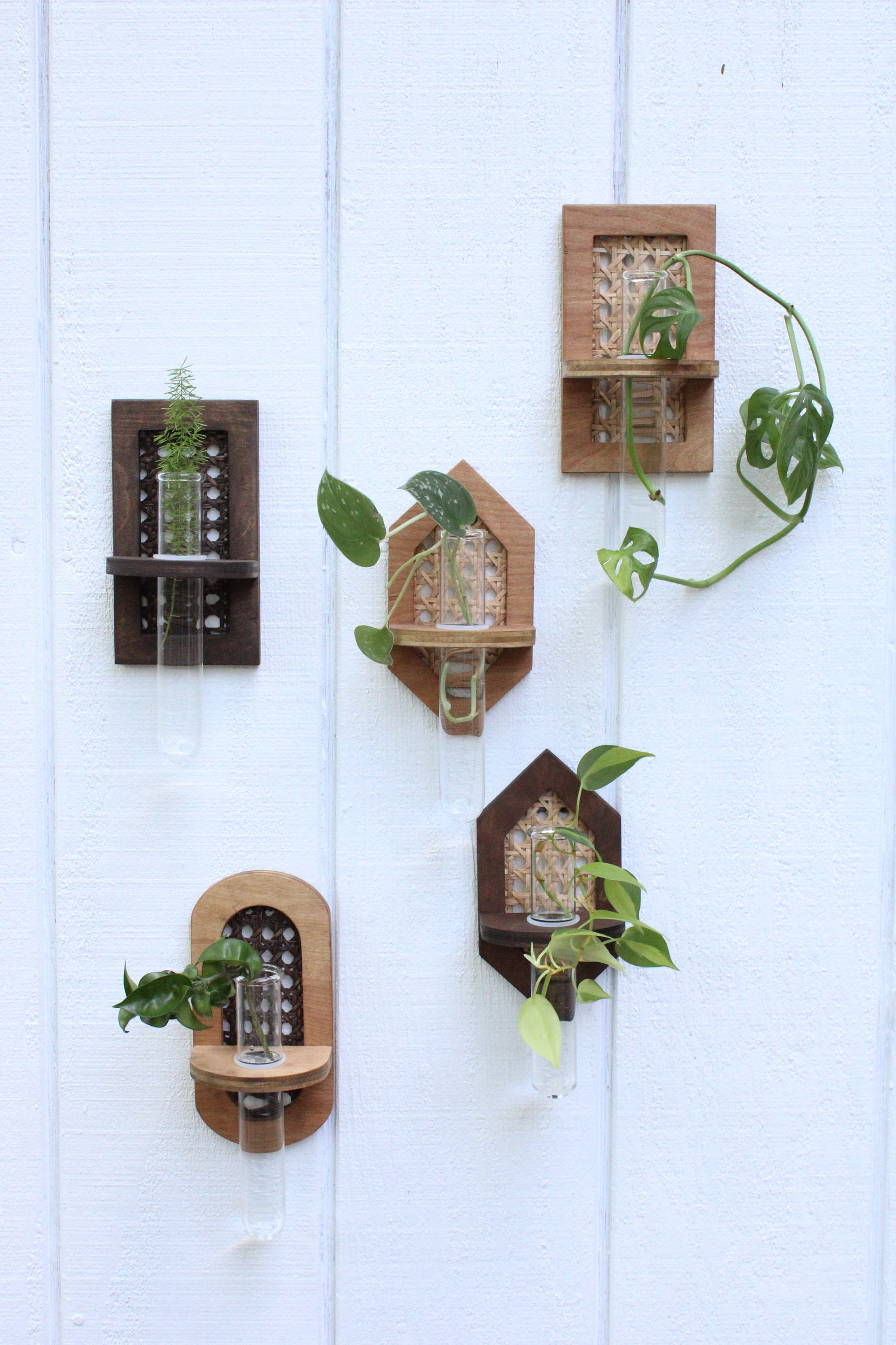 Rattan propagation wall hangings. Choose your shape and finishes. We offer oval, rectangle, and hexagon. Purchase individually or in a set. Each hanging comes with a jumbo test tube and silicone O ring for adjustable tube height. The tube measures 1.5X8" and bases measure roughly 7.5X4" depending what shape you purchase. Pieces attach to the wall with a sawtooth hanger installed on the back side of the base. See our storefront for additional propagation options.