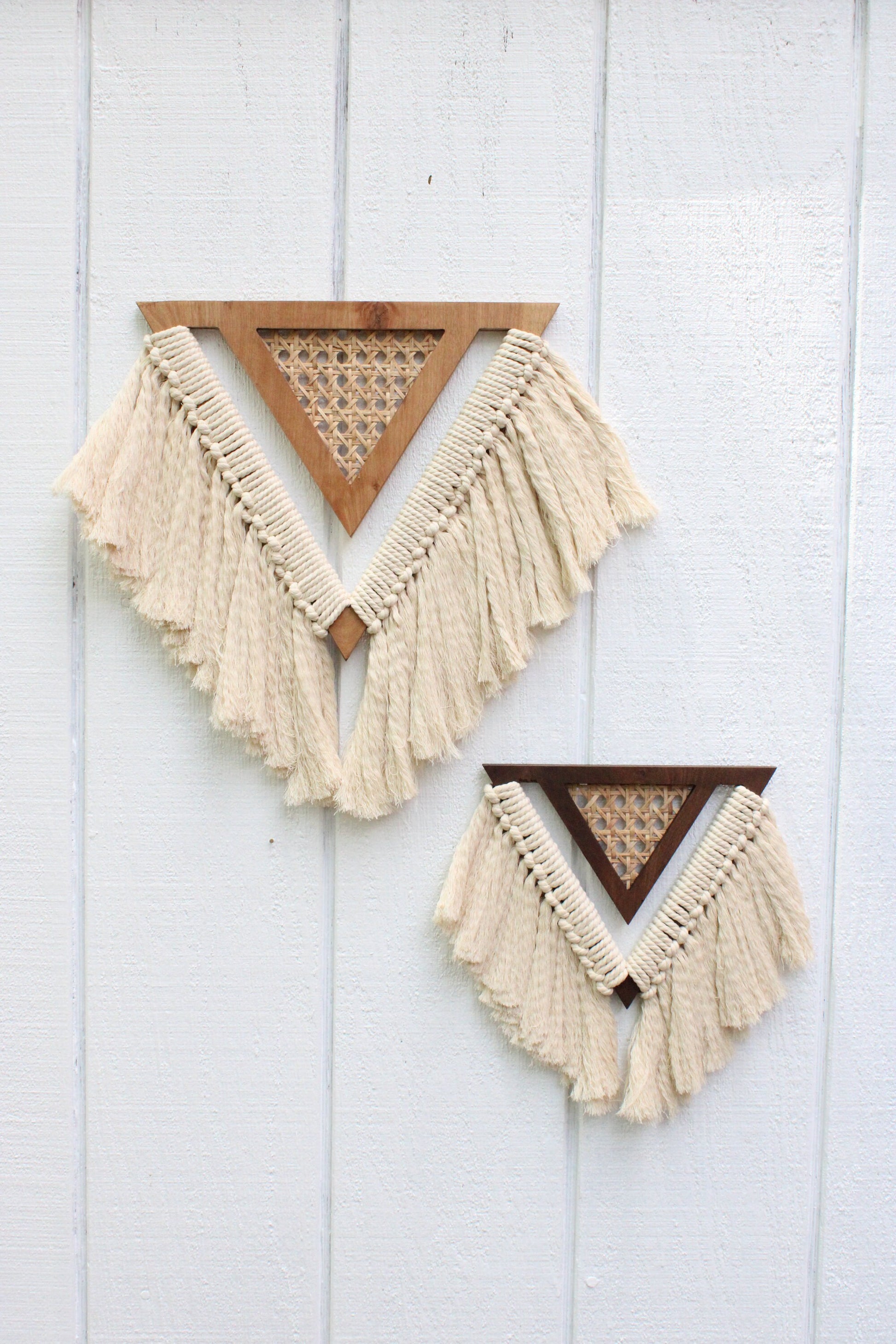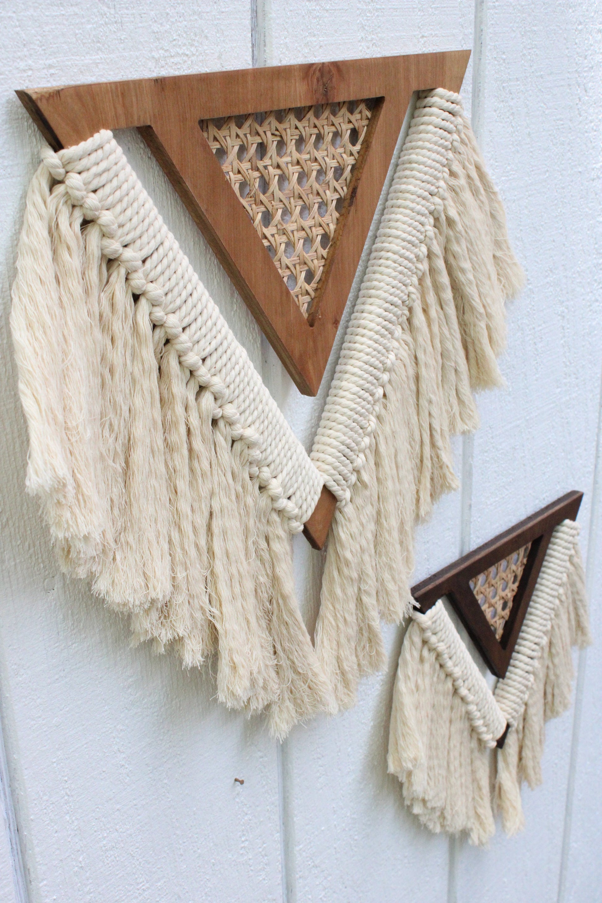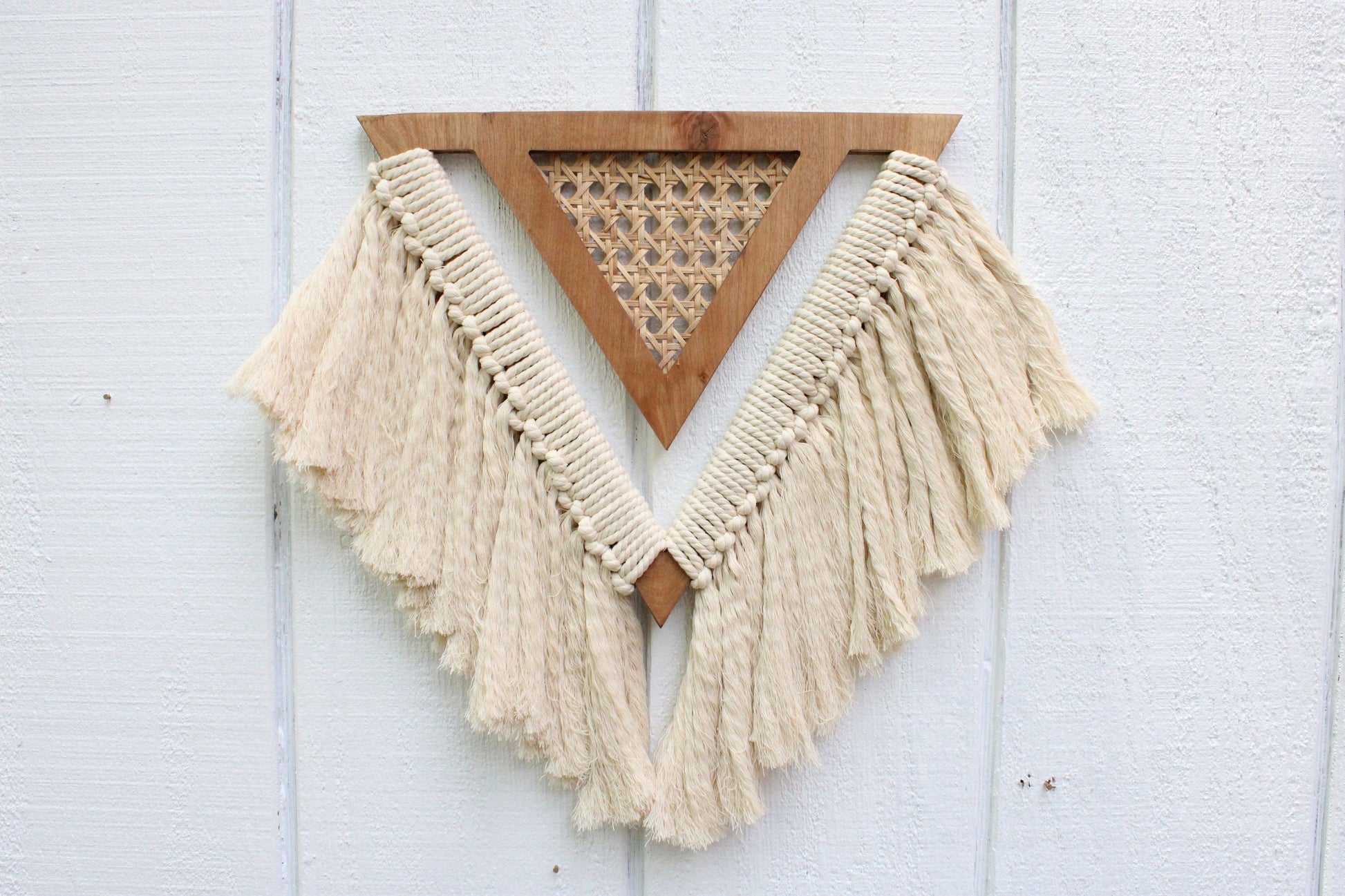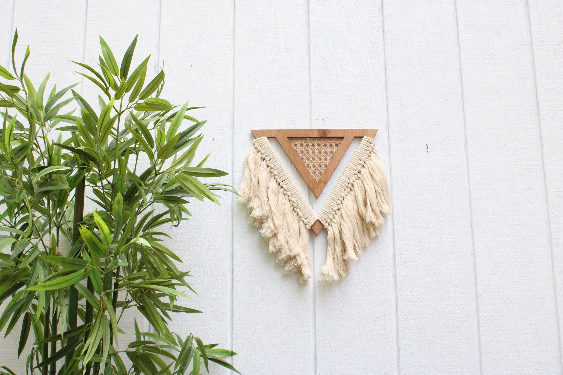 Boho Rattan Wall Art. Choose from 2 sizes and 2 finishes. Large (13X16") or small (9X11"). This piece comes with a sawtooth hardware for hanging. Our pieces are CNC cut and embellished by hand with REAL rattan (not laser cut/faux rattan)