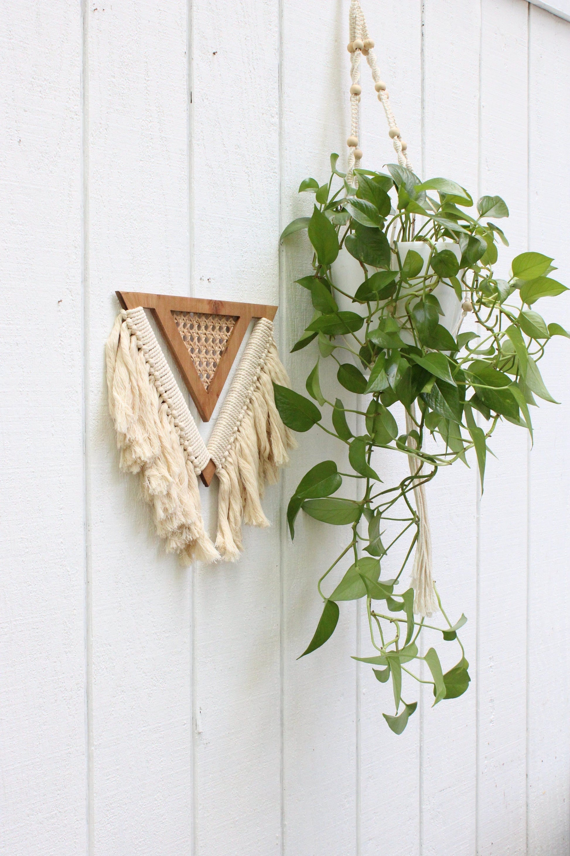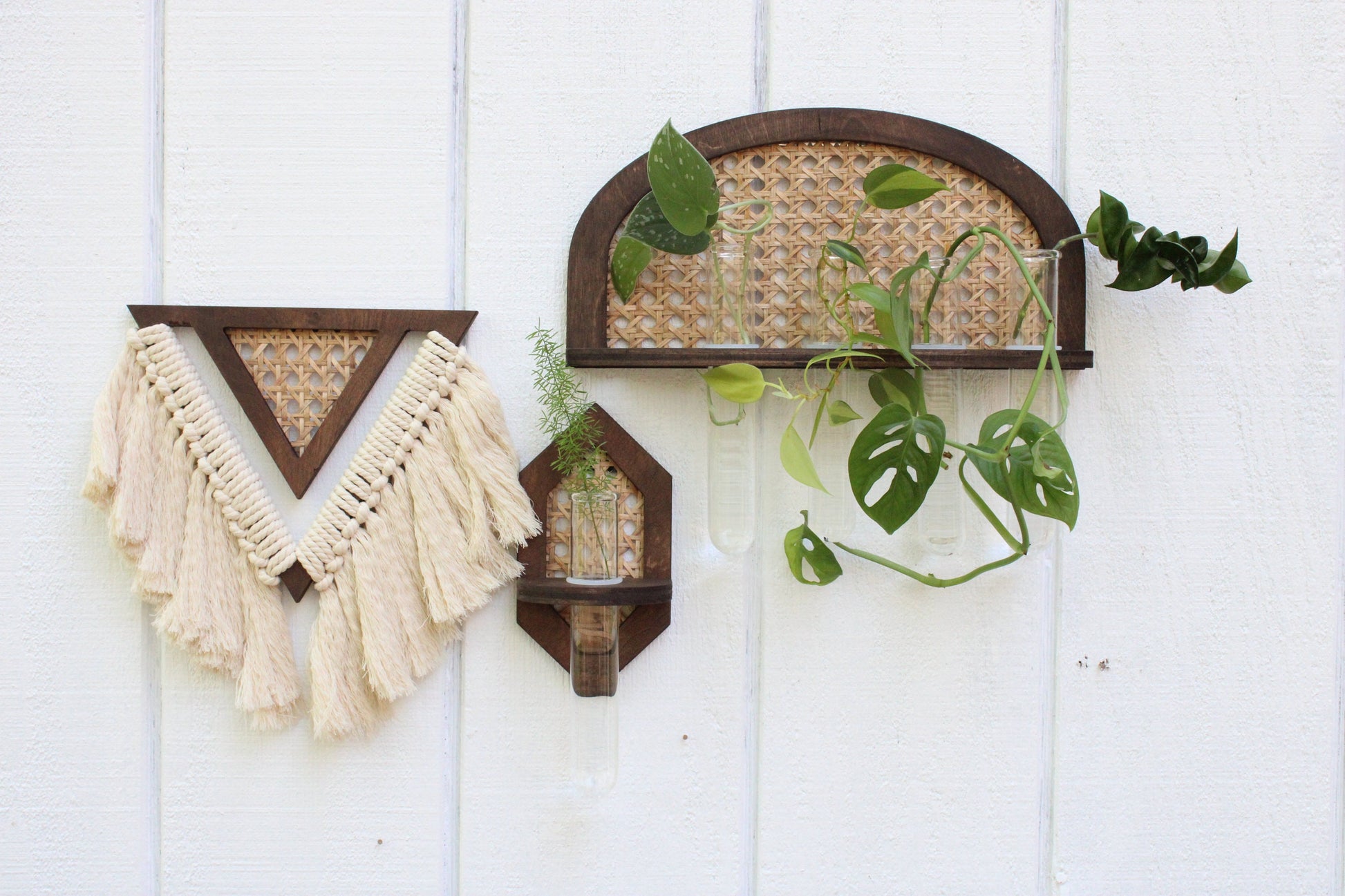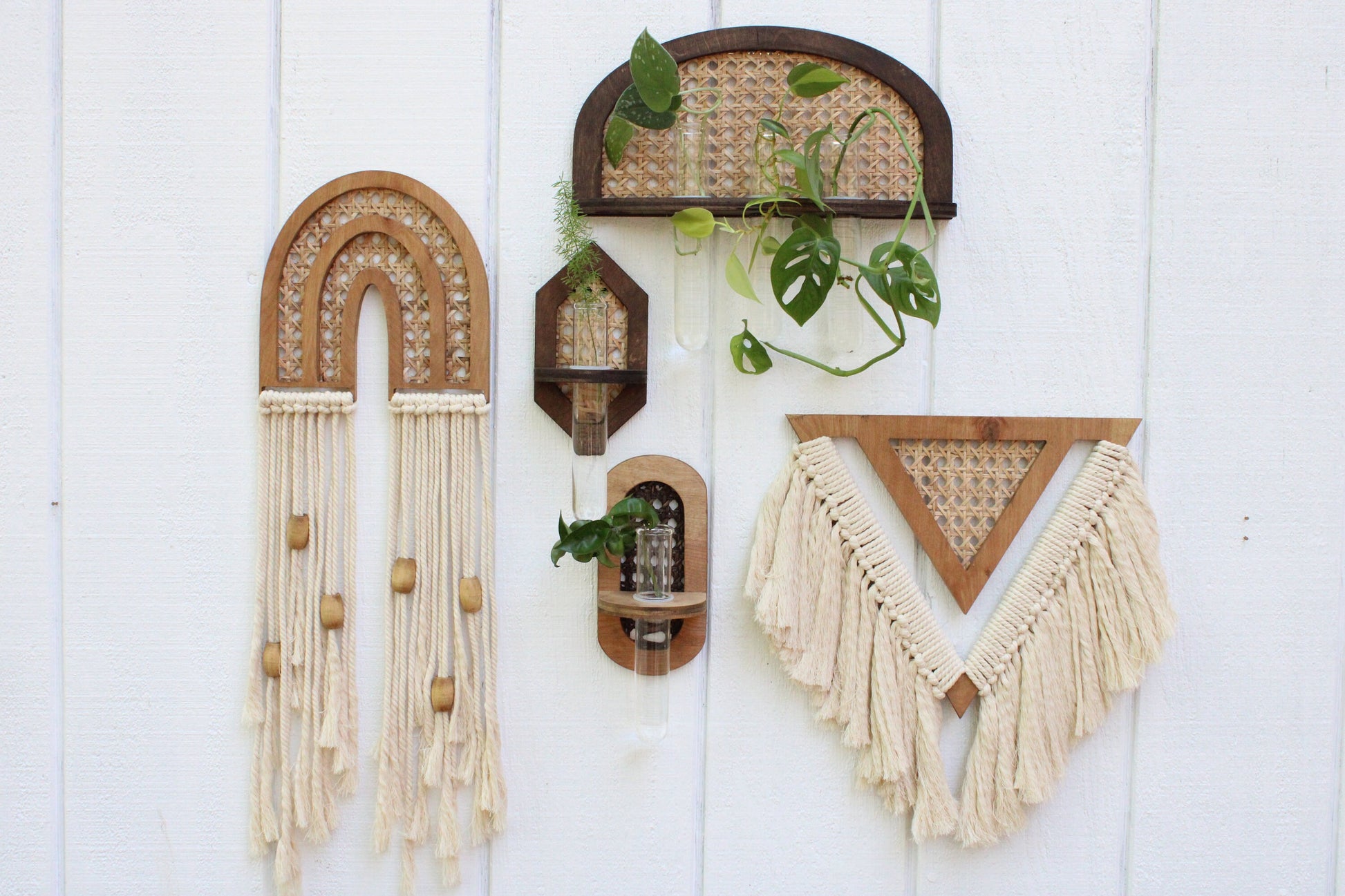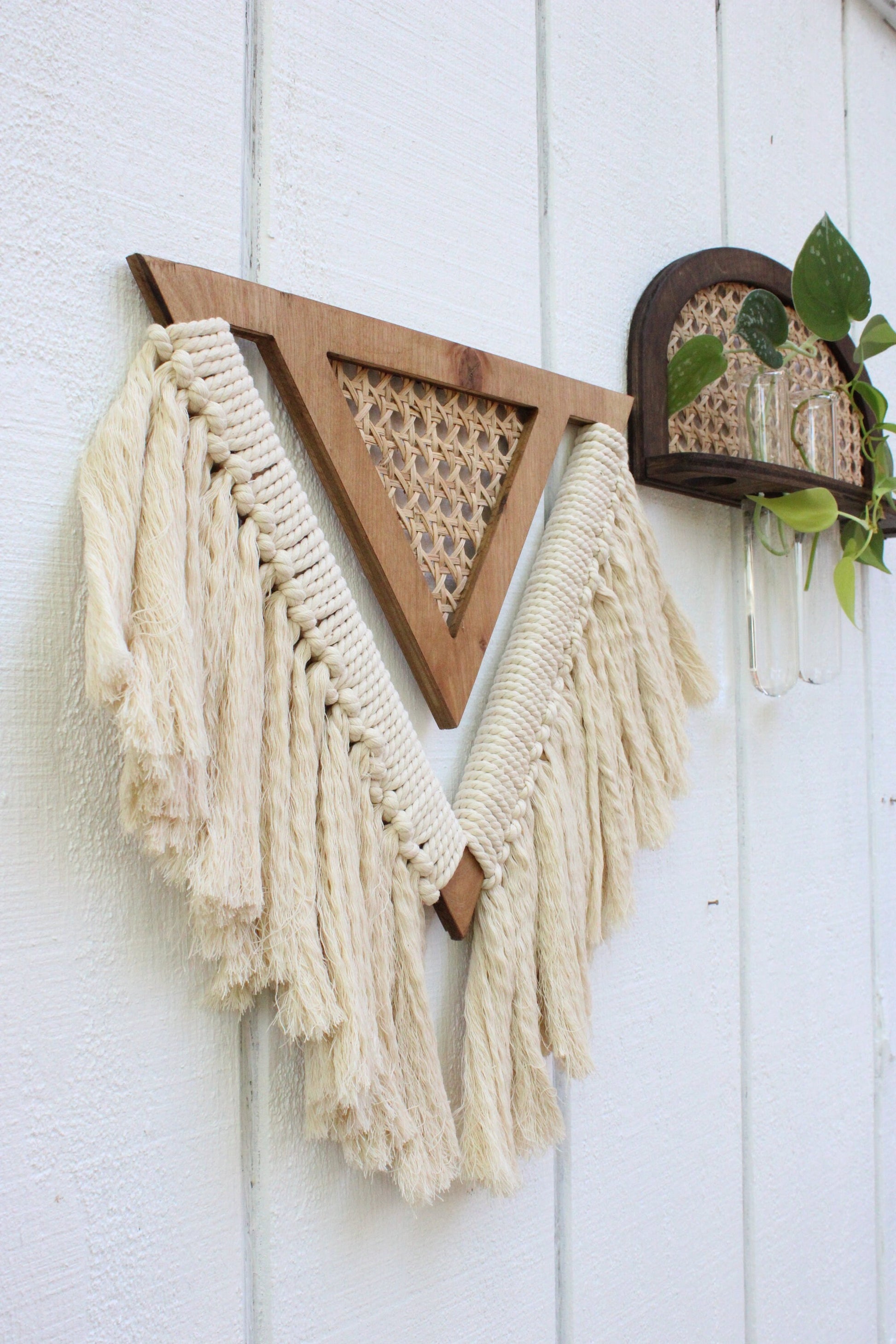 Boho Rattan Wall Art. Choose from 2 sizes and 2 finishes. Large (13X16") or small (9X11"). This piece comes with a sawtooth hardware for hanging. Our pieces are CNC cut and embellished by hand with REAL rattan (not laser cut/faux rattan)